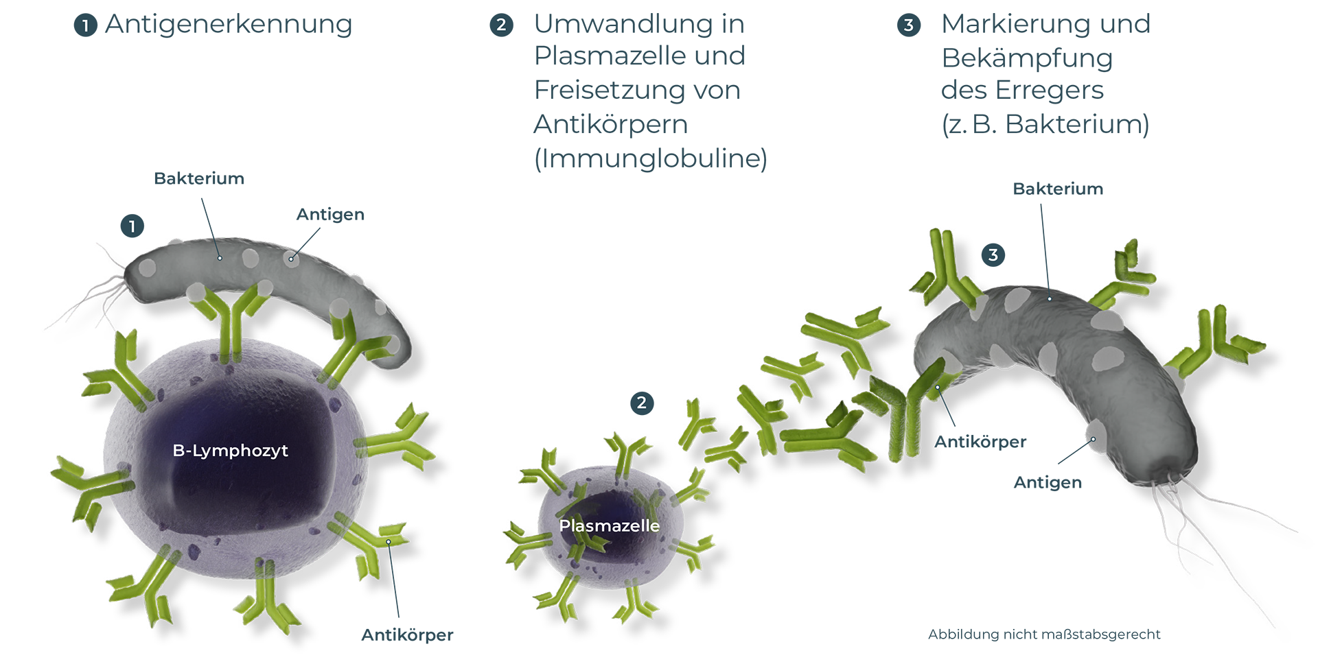 Antikörper werden folgendermaßen von Ihrem Körper herstellt: Wenn Ihre Blutzellen vom Typ B-Lymphozyten mit einem körperfremden Antigen in Kontakt kommen, werden sie aktiviert und bilden als Plasmazelle spezielle Antikörper. Diese erkennen den Fremdkörper und leiten damit die Bekämpfung des Erregers ein. Die Antikörper werden von den Plasmazellen maßgeschneidert produziert, sodass sie genau an ein Antigen andocken. Wenn Ihr Körper schon einmal mit einem bestimmten Erreger in Berührung gekommen ist, bilden die dadurch trainierten und spezialisierten B-Lymphozyten das Gedächtnis für dieses Antigen und können künftig bei erneutem Kontakt schnell mit der Antikörperproduktion beginnen. Dieses Prinzip liegt zum Beispiel auch Impfungen gegen Infektionskrankheiten zugrunde.Die Bildung und Funktion von Antikörpern (Immunglobulinen)
