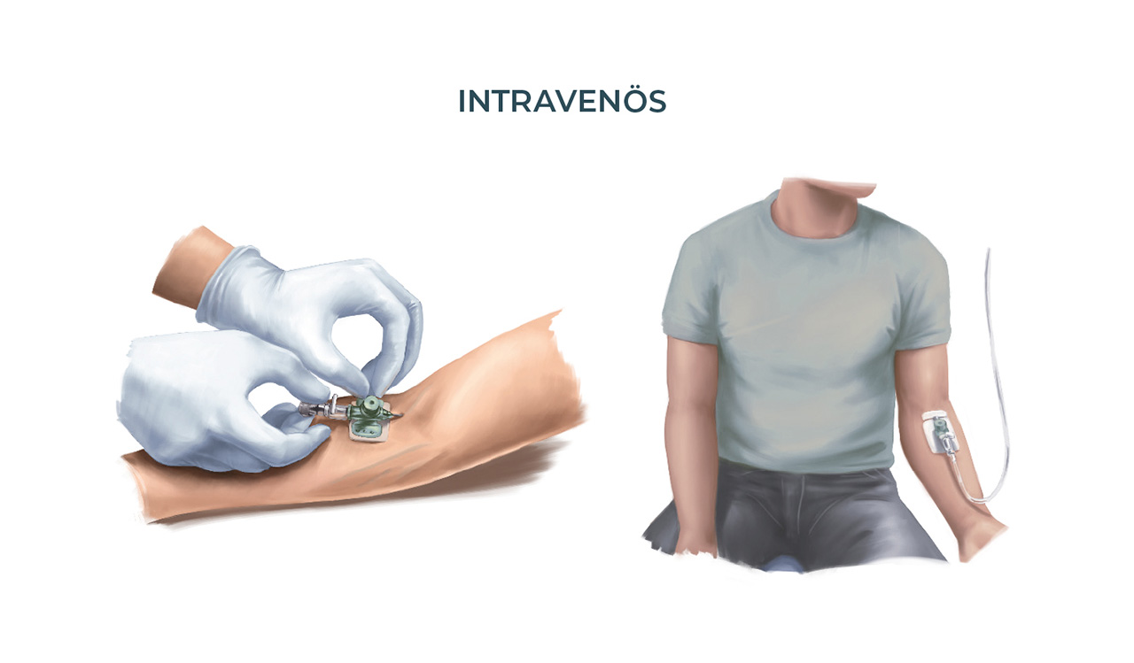 Immunglobuline können intravenös oder subkutan verabreicht werden. Eine Entscheidung für die Art der Gabe wird zusammen von Arzt und Patient getroffen und hängt von verschiedenen Faktoren ab. Immunglobuline können Sie nicht als Tablette einnehmen, da sie im Magen und im Darm abgebaut würden und dann keine Wirkung mehr hätten. Dahererfolgt die Behandlung mit Immunglobulinen als Infusion – entweder intravenös, also in die Vene (intravenöse Immunglobuline, IVIg), oder subkutan, also unter die Haut (subkutane Immunglobuline, SCIg).Intravenöse Immunglobuline